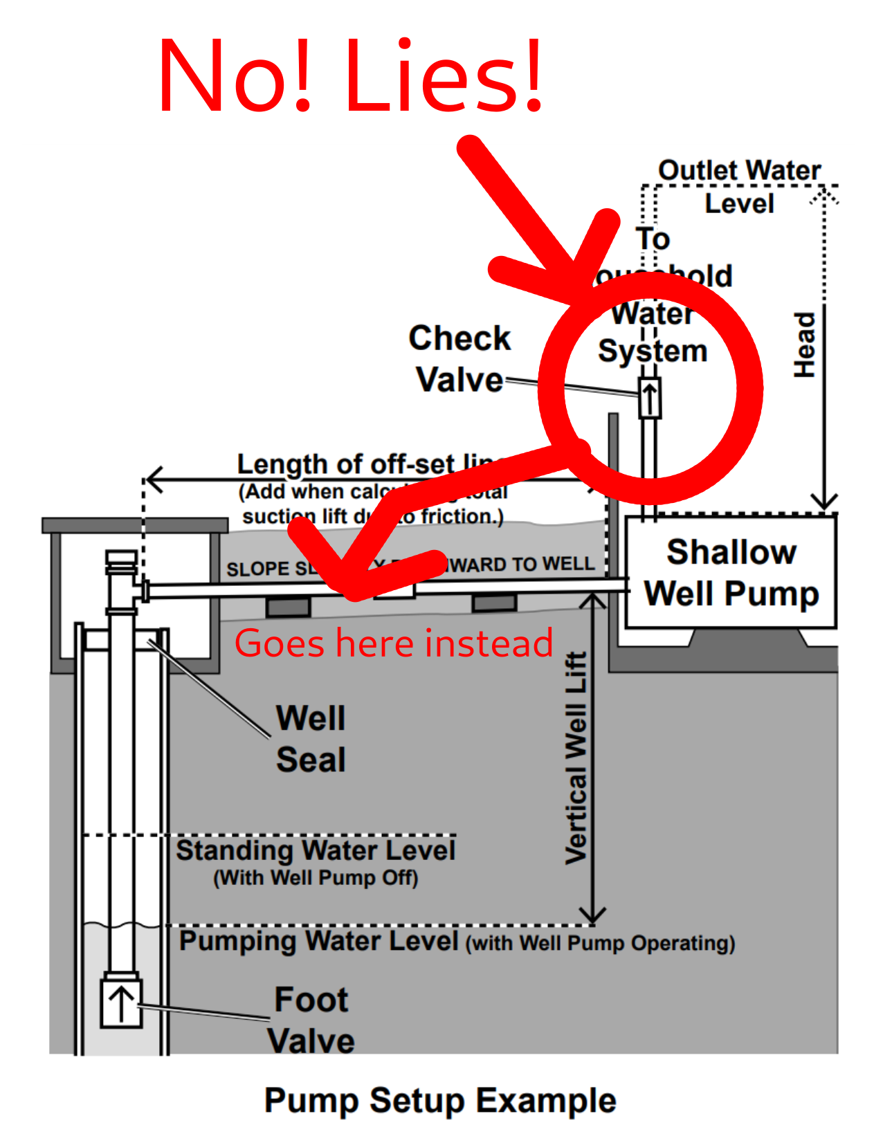 The pump's installation instructions showed a check valve (one-way water flow) installed in between the pump and the house