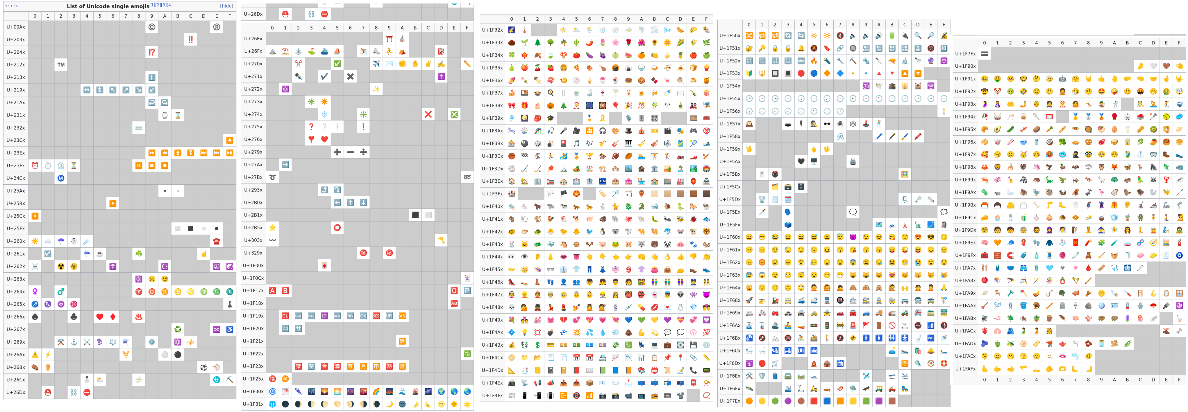 - See all those grey empty spaces? That's non-emoji characters that are in those same code point ranges. You probably don't want to accept "Βͺ", "Β«", etc. as emoji.