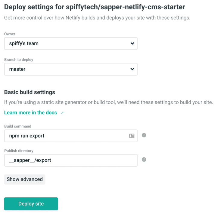 Configure your build process. Set the build command to generate the static Sapper site, and the publish directory to the directory where Sapper exports to.